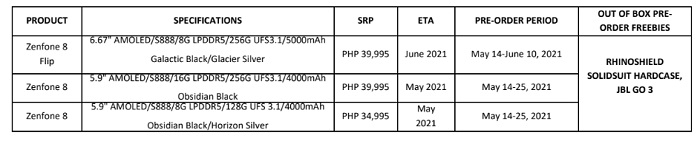 ASUS Zenfone 8 series will be available for pre-orders which started May 14, 2021 at official ASUS Concept Stores, accredited online and offline shops.Successful pre-order registrants will receive a free Rhinoshield Solidsuit Hardcase and a JBL Go 3 alongside the model of choice, to complete the Zenfone experience.